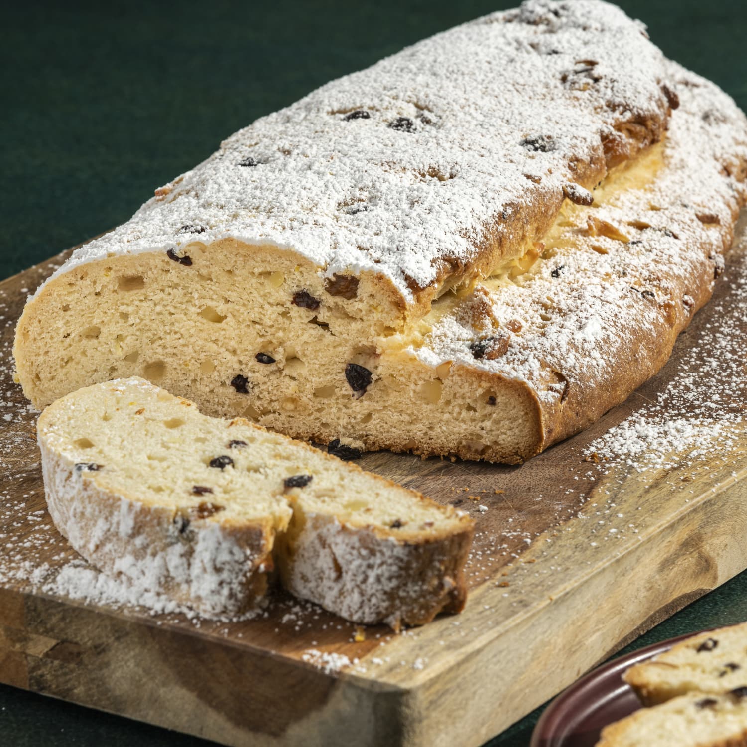 Stollen is a fruit bread from Germany that is traditionally eaten during Christmas. It is made with wheat flour, butter, eggs, yeast, sugar, dried fruits, nuts, and spices such as cardamom, cinnamon, and nutmeg. It is shaped into a long loaf and dusted with powdered sugar. It can be filled with marzipan or almond paste.
